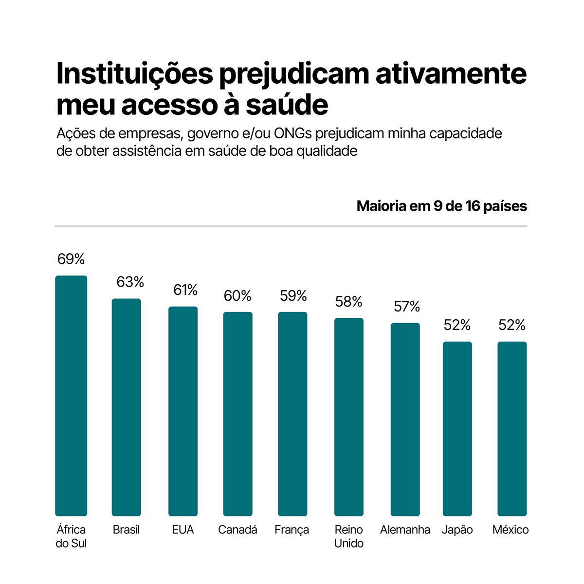 Em 9 dos 16 países pesquisados, a maioria dos entrevistados acredita que as ações de empresas, governo e/ou ONGs prejudicam sua capacidade de obter assistência em saúde de boa qualidade.