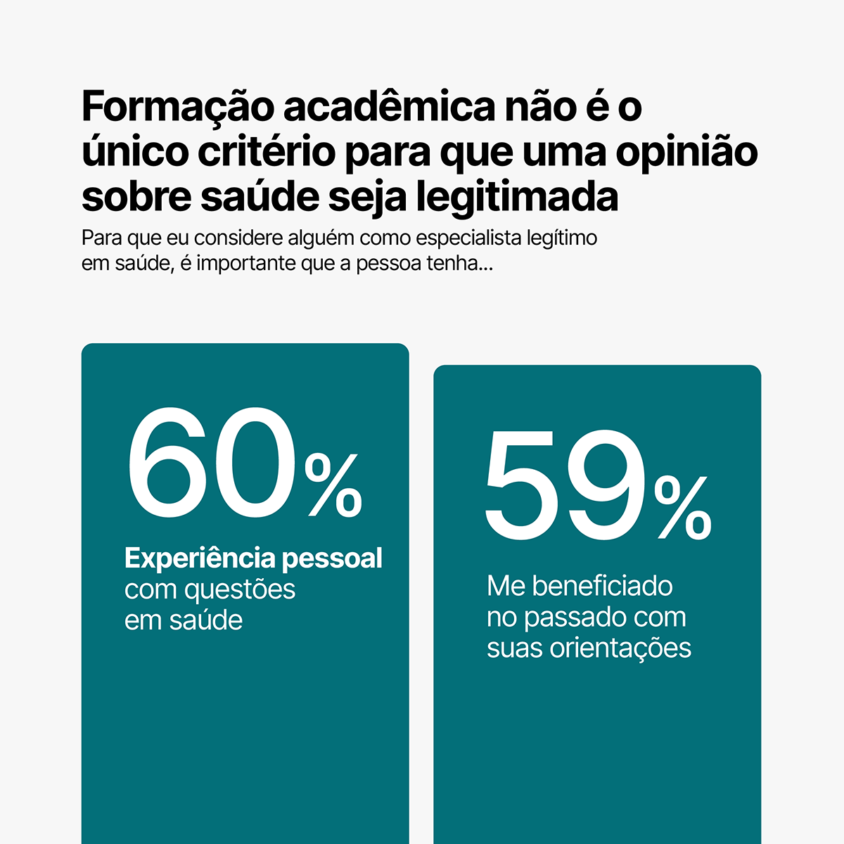 Embora a formação acadêmica seja o critério mais importante para considerar alguém como um especialista legítimo em saúde, 6 em cada 10 brasileiros afirmam que a experiência pessoal com questões de saúde e orientações úteis dadas anteriormente também qualificam alguém como especialista.