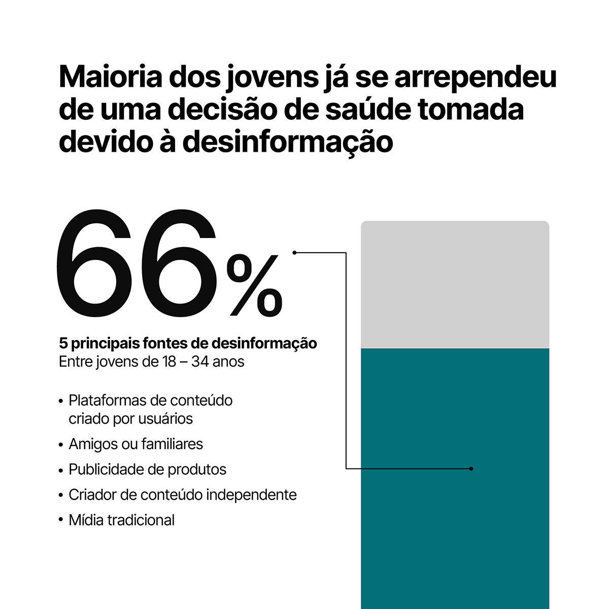 Além de serem mais suscetíveis à influência de pessoas sem formação acadêmica formal, os jovens (18 – 34) também são os mais propícios a se arrependerem de uma decisão de saúde baseada em desinformação, advinda de plataformas de conteúdo criado por usuários, amigos ou familiares, publicidade de produtos e criadores de conteúdo.