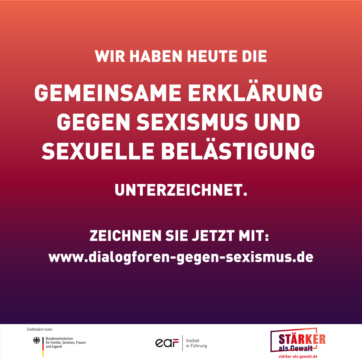 Die Erklärung ist das Ergebnis der „Dialogforen gegen Sexismus“, die das Bundesfrauenministerium zusammen mit der Europäischen Akademie für Frauen in Politik und Wirtschaft Berlin (EAF Berlin) durchgeführt hat. Die Gemeinsame Erklärung wird von vielen Partnern aus Wirtschaft und Gesellschaft getragen und von der Initiative „Stärker als Gewalt“ unterstützt.