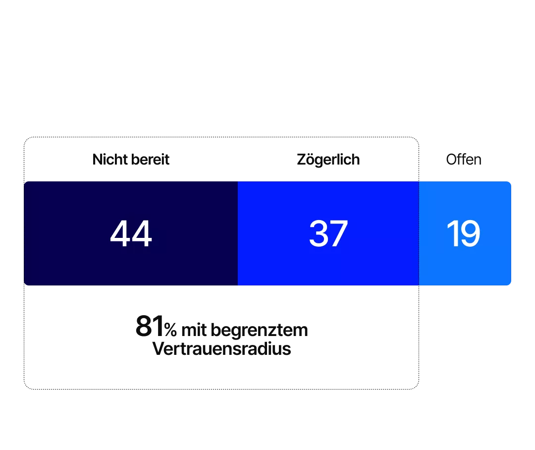 1. Die verbreitete Abschottung bremst FortschrittAuch in Deutschland begünstigen wirtschaftliche Unsicherheit, wachsende Ängste und sinkender Zukunftsoptimismus einen Rückzug von Vertrauen ins Eigene. 8 von 10 Menschen sind zögerlich, anderen zu vertrauen, die sich in Werten, Faktenquellen oder Lebensrealitäten unterscheiden. Vertrauen wird dadurch enger gefasst und stärker an Nähe und Übereinstimmung gebunden. |
