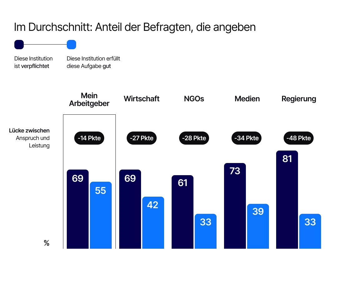 4. Arbeitgeber sind besonders gut geeignet, Vertrauen zu vermittelnWenn es um das Vermitteln von Vertrauen geht ist ist die Differenz zwischen Erwartung und Leistung bei Arbeitgebern geringer als bei anderen Institutionen. In Deutschland sind 69% der Meinung, Arbeitgeber seien dazu verpflichtet – 55% sagen, sie machen das gut. Gleichzeitig genießen Arbeitgeber hohes Vertrauen: 74% vertrauen dem eigenen Arbeitgeber – als einziger Institution im Vertrauensbereich. |