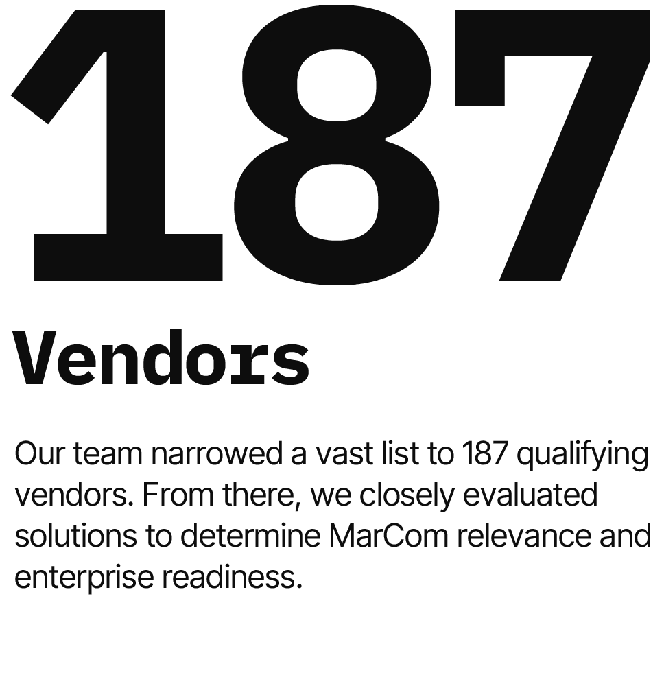 The first in a series of evaluation guides, this report’s contributors vetted over 180 of the most relevant vendors for marketing and communication teams. We did this through the lens of professional use cases, with vendors undergoing rigorous evaluation against set criterion points across three solutions categories and six common use cases. The year-long process included demos, testing, market research, and blind scoring, thus ensuring accurate and unbiased results.