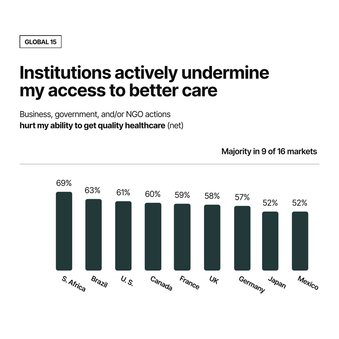 In 9 out of the 16 countries surveyed, a majority of respondents believe business, government, and/or NGOs are actively undermining access to quality care.