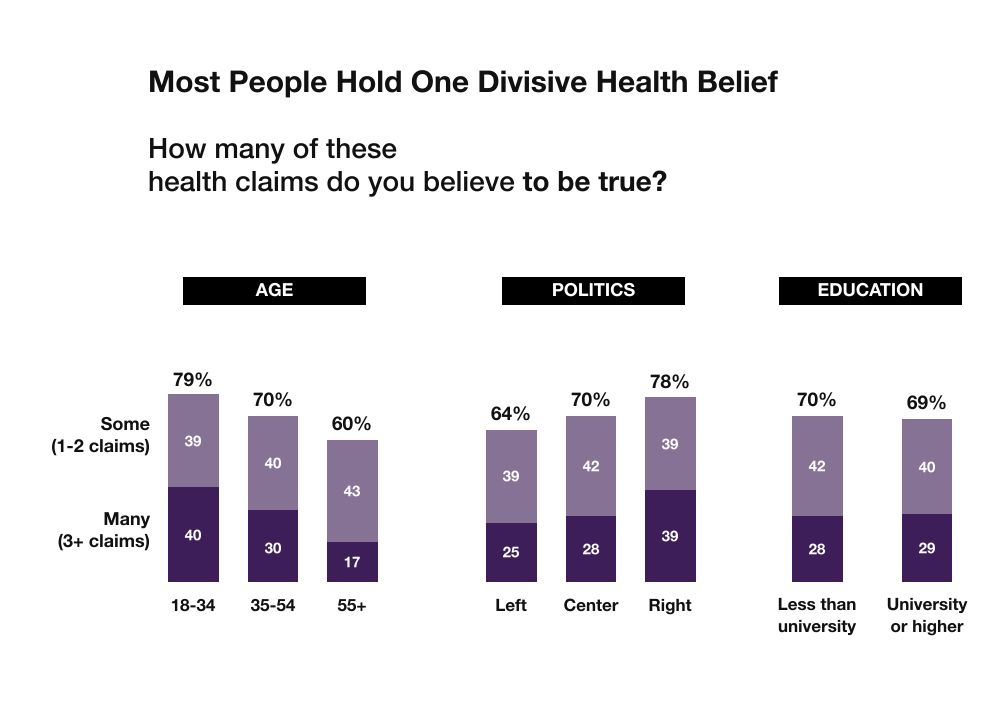 The majority (70%) of people worldwide believe at least one of six divisive health claims about foods, vaccines, and medicines to be true, cutting across age, political affiliation, and education.
