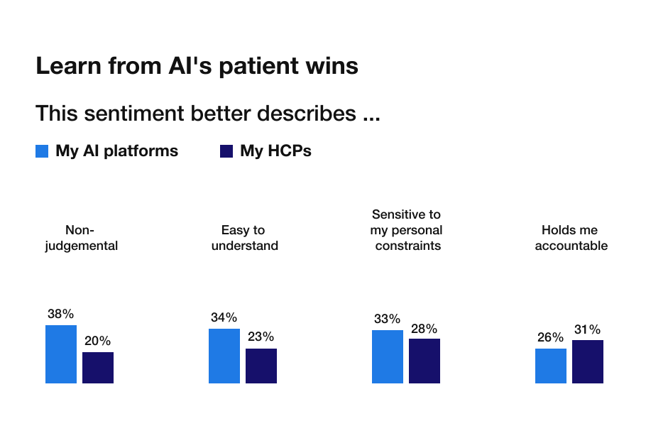 AI is becoming a meaningful tool in how people make health decisions. Among the 35% who use AI to manage their health, its appeal over doctors is straightforward: it feels nonjudgmental, easy to understand, and sensitive to personal constraints.