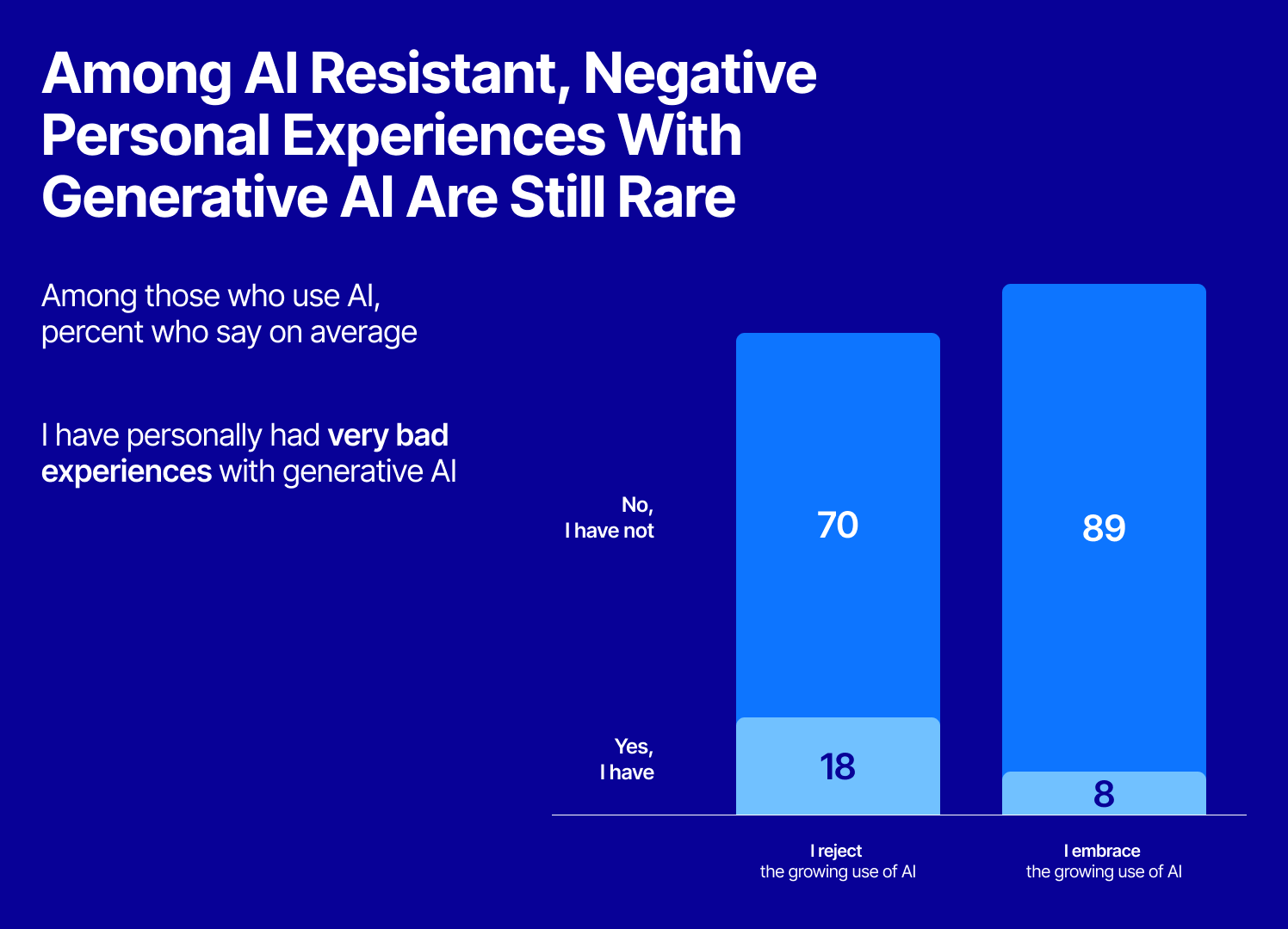 The findings are particularly striking given how little negative first-hand experience exists. Only 18% of people who reject the growing use of AI, and just 8% of those who embrace it, say they’ve had a very bad generative AI experience.
