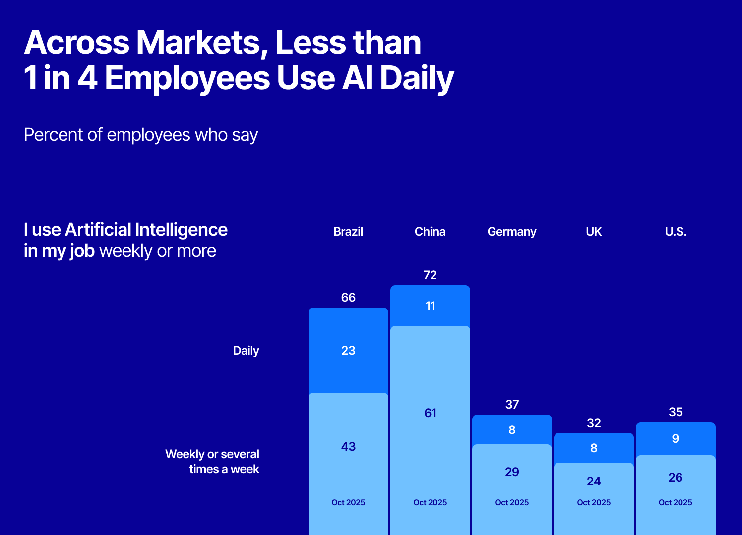 Across markets, usage is rising year over year, yet regular adoption remains limited. In Germany, the UK, and the U.S., only a minority of employees use AI weekly, and in the U.S., daily use is still in the single digits.