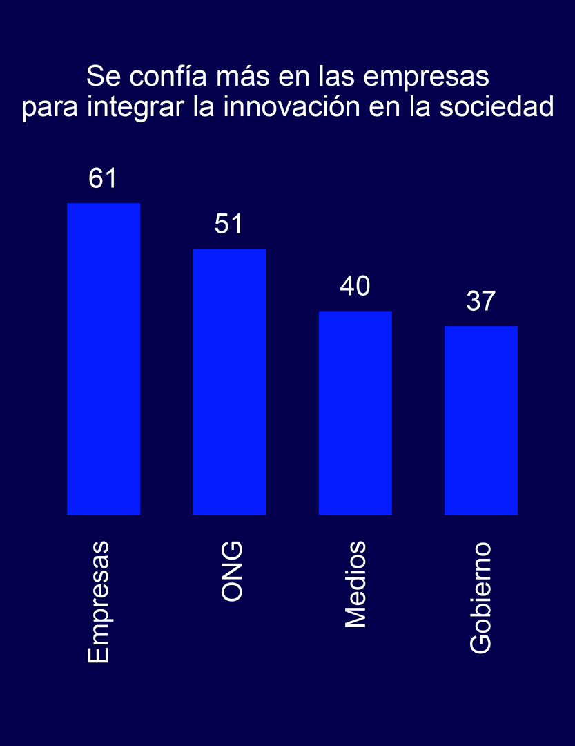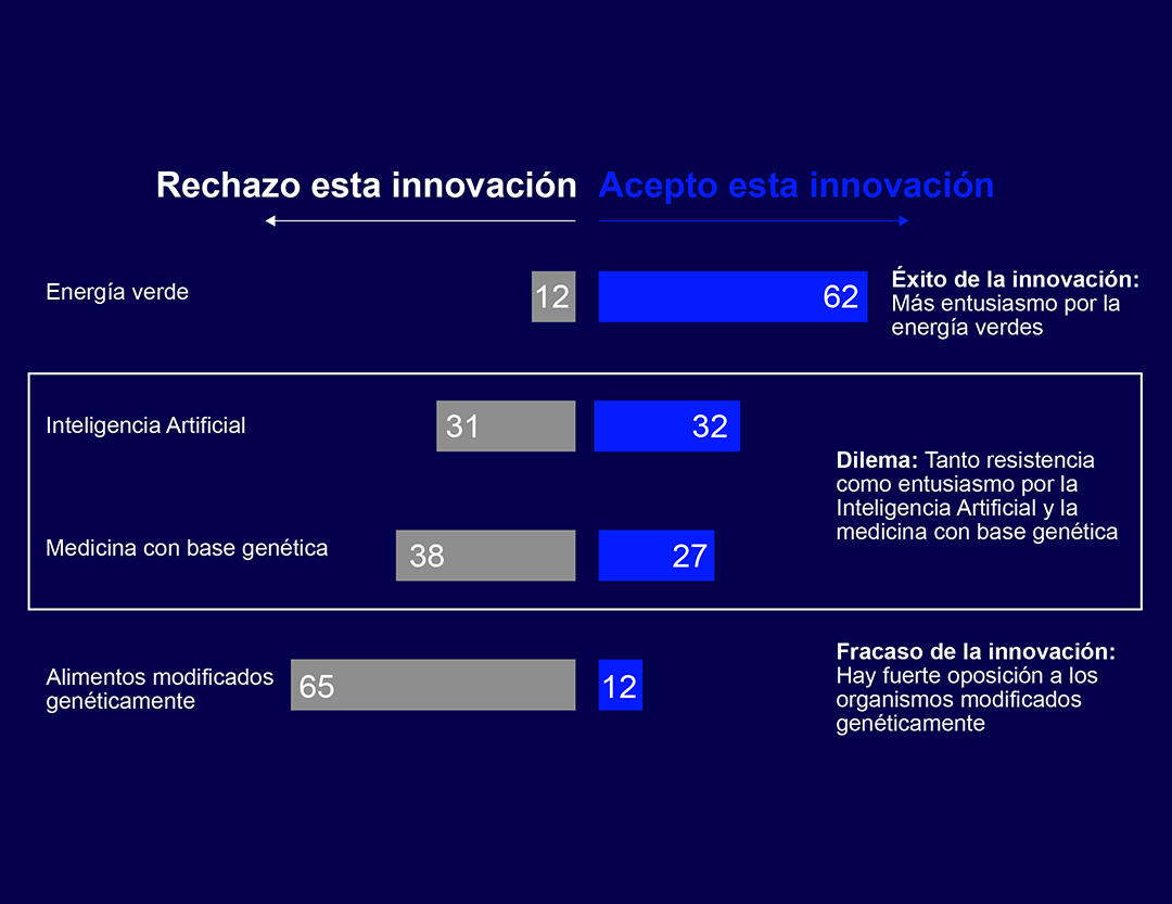 Los encuestados, por un margen de casi dos a uno, creen que la innovación está mal gestionada (insuficiente regulación gubernamental, falta de confianza en los líderes tradicionales, sospecha de la independencia de la ciencia de la política y el dinero). Los encuestados necesitan saber que las innovaciones han sido evaluadas por científicos y especialistas en ética y que están reguladas de manera efectiva, además de sentirse en control sobre el impacto que tienen en sus vidas.