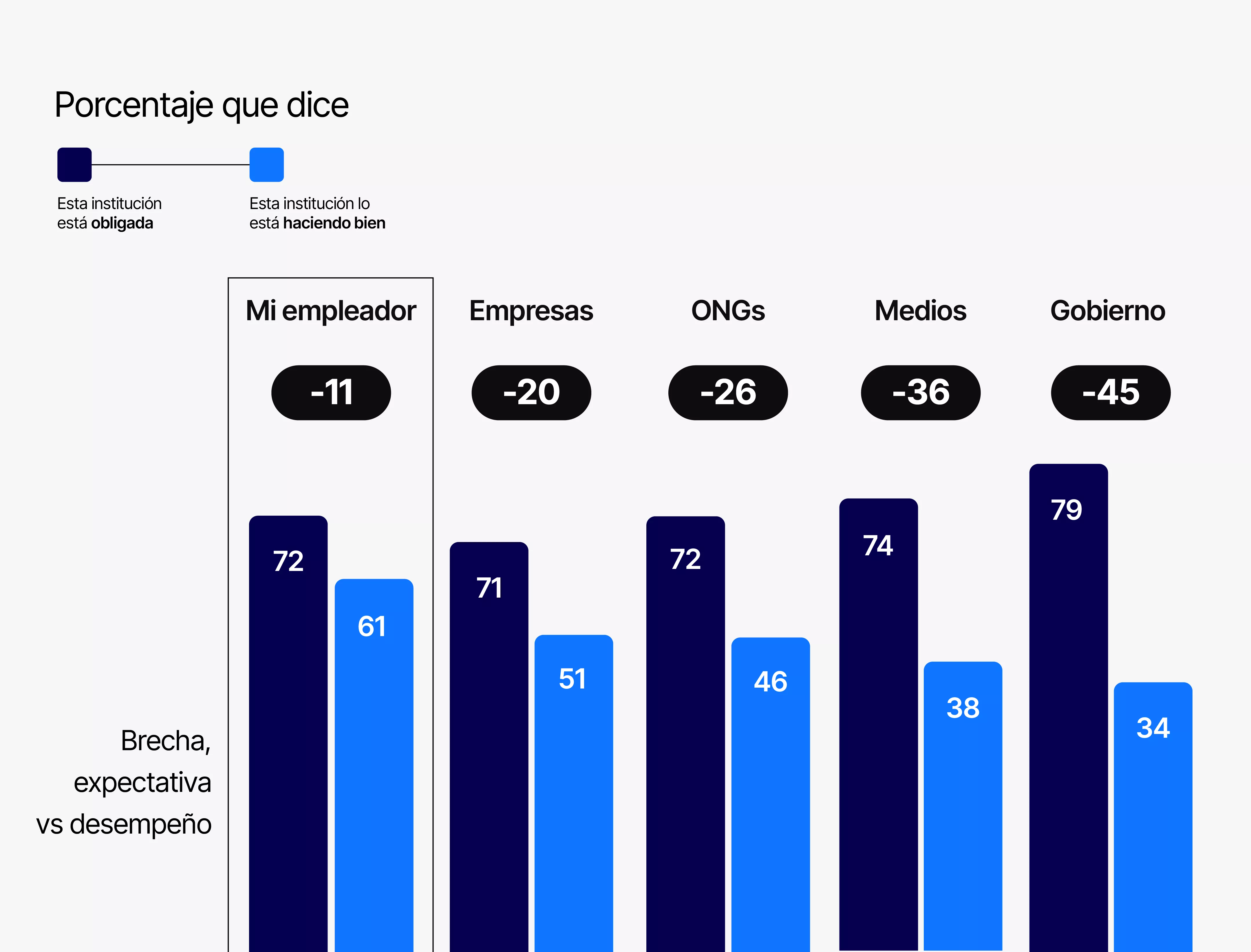 4. Los empleadores están bien posicionados para escalar el Brokering de ConfianzaLos empleadores tienen una brecha entre expectativas y desempeño menor cuando se trata de Brokering, y gozan de un alto nivel de confianza entre sus empleados. Esto deja a las empresas bien posicionadas para escalar la mediación a través de capacitaciones de resolución de conflictos y creando oportunidades para tender puentes entre personas. |