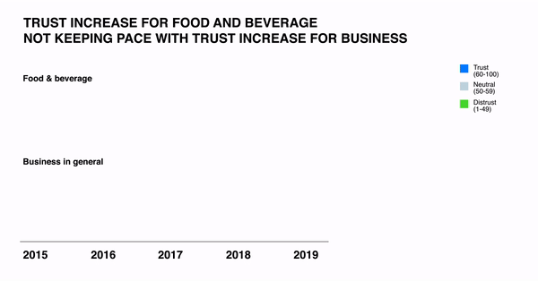 The 2019 Edelman Trust Barometer: Food and Beverage report brings to light a sector experiencing a slight recovery in trust after a four-point drop in 2018 yet it is not keeping pace with recovery and growth in trust in business overall. When evaluating results across the 26 markets, most of them are not back to their 2017 trust levels and the food and beverage sector garners higher levels of trust than business in general. However, over eight years, food and beverage trust levels moved from 64 to 68 percent, while trust in business increased from 47 to 56 percent. When we look at food and beverage sub-sectors, we also see a slight recovery in all of them, with the exception of additives which was just added in 2019.